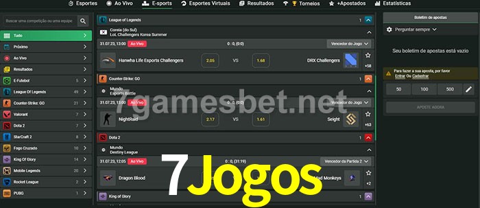 O 7Jogos oferece uma grande seleção de opções de apostas em e-sports com probabilidades competitivas